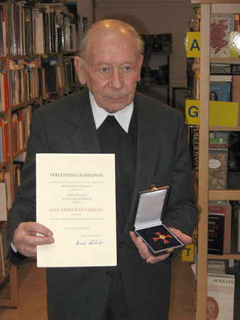 Prälat Globisch mit dem Bundesverdienstkreuz 1. Klasse und der Verleihungsurkunde – aufgenommen in der deutsch-polnischen Caritas-Zentralbibliothek in Oppeln.