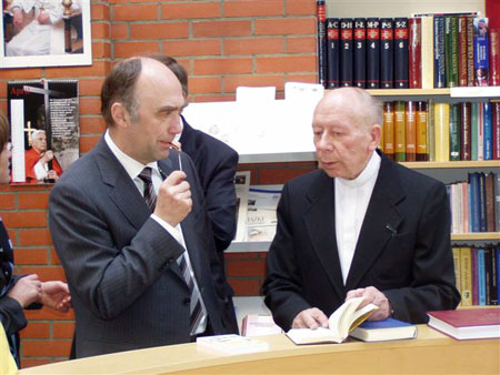 Prälat Globisch zusammen mit dem Parlamentarischen Staatssekretär beim BMI Dr. Christoph Bergner, dem Beauftragten der Bundesregierung für Aussiedlerfragen und nationale Minderheiten, in der Caritas-Zentralbibliothek – zur Verfügung gestellt vom Konsulat der Bundesrepublik Deutschland in Oppeln.