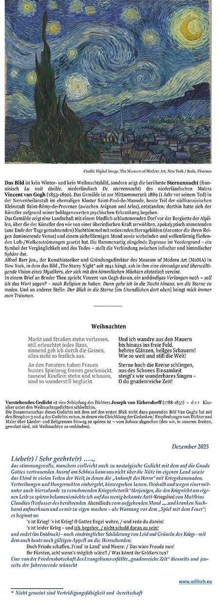 Liebe(r) / Sehr geehrte(r) …, ein frohes Weihnachtsfest, einen geruhsamen Ausklang des alten Jahres und ein glückliches neues Jahr wünscht/en Dir/Euch/Ihnen Lass/t/en Dich/Euch/Sie sich anrühren von den altvertrauten weihnachtlichen Bildern, Texten, Melodien … ............................................................................................ |